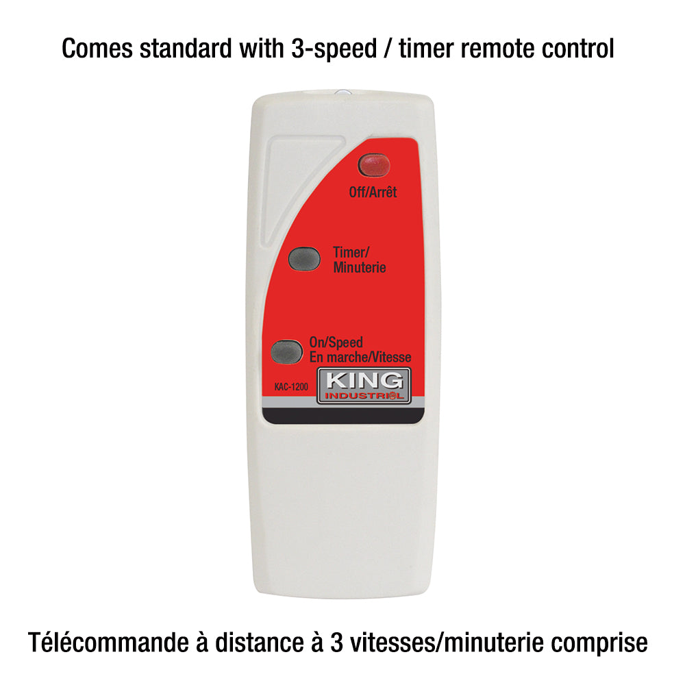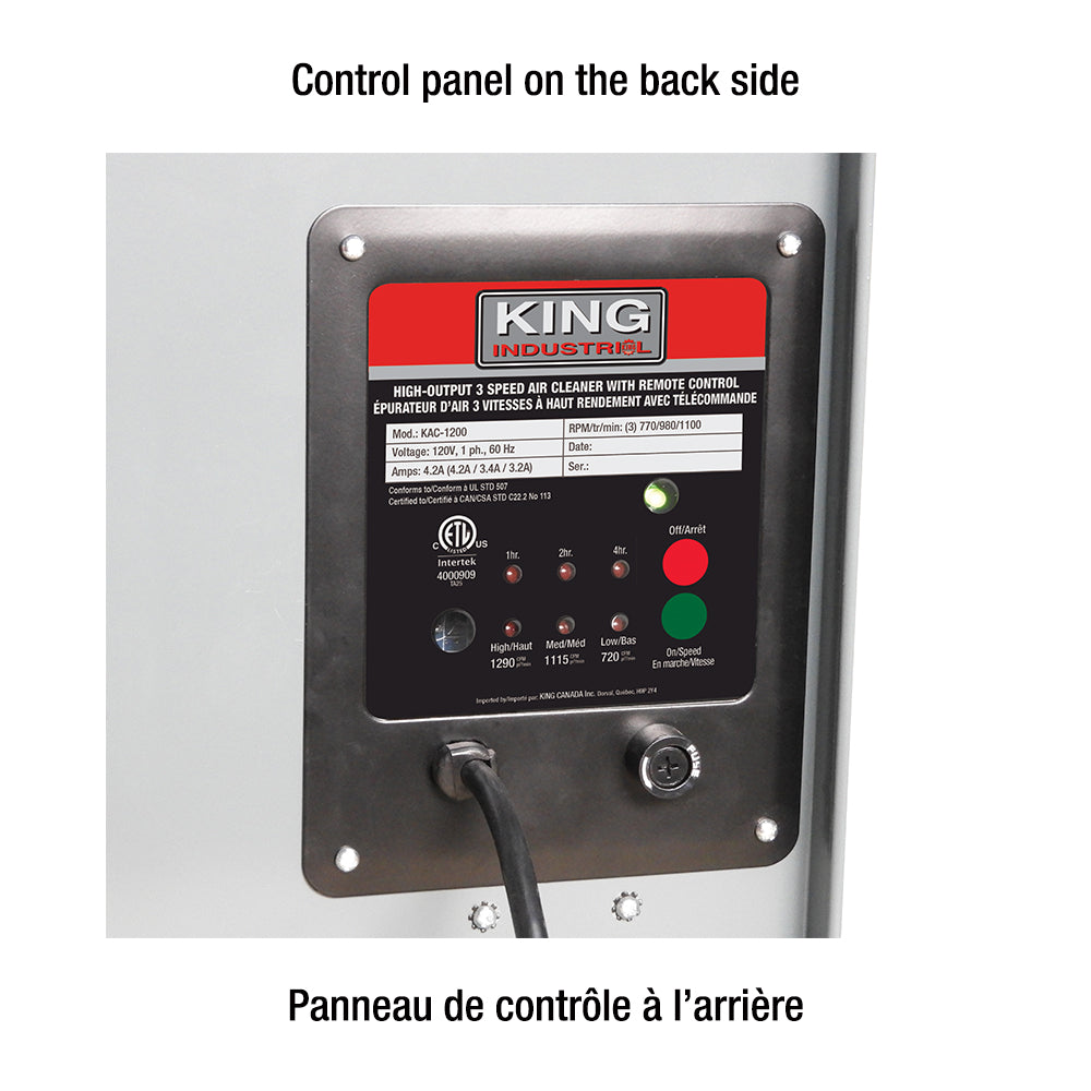• The King KAC-1200 Air Cleaner efficiently boosts your workshop’s air quality with three adjustable speeds (720, 1115, 1290 CFM) while operating quietly. Featuring two-stage filtration with a disposable 5-micron outer filter and a 1-micron inner three-pocket filter, it captures fine particles effectively. Versatile in installation, it can sit on your workbench, hang from the ceiling, or mount on a wall or ceiling. Plus, the built-in timer lets you set it to turn off automatically after 1, 2, or 4 hours for convenient, hands-free operation.