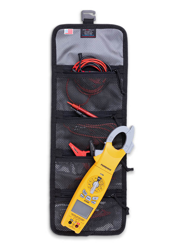 Handmade in New England (USA), the TR1 roll is ideal for storing and protecting meter test leads and specialty probes. It is also a handy little pouch for small tools and instruments. The TR1 is a ruggedly built tool roll with 4 individual zippered pockets all constructed with durable mesh for breathability. The 2 lower pockets are lined with vinyl for protecting sensitive probe tips. The aluminum hook for securing the tool roll closed can double as a hook for hanging the open roll. Our stainless steel Repositionable Belt Clip (RBC – sold separately) can also be added to the rear webbing loop for attaching to a waist belt or side of tool bag.