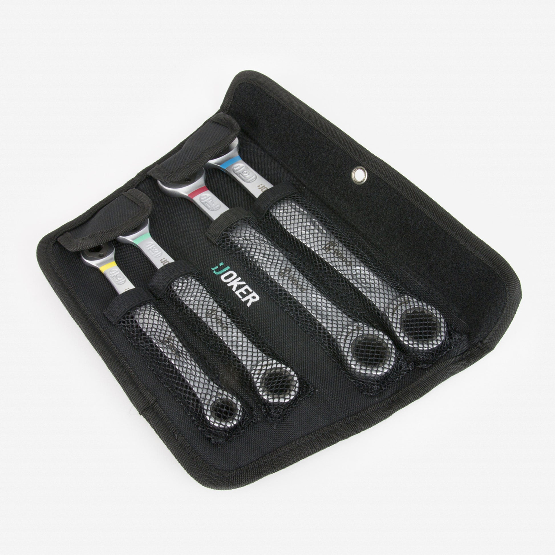 High quality combination ratchet wrench set by Wera: everything that a wrench has to be able to do. And a whole lot more. Faster, better, stylish. Yes, a real Joker. The new generation of combination ratchet wrenches. 4-piece set in a robust pouch. Suitable for hexagon bolt heads or nuts. Comes with a holding function, thanks to the metal plate in the jaw, which reduces the risk of dropping nuts and bolts. The replaceable metal plate in the jaw secures nuts and bolts with its extra hard teeth and limits the danger of slipping. The integrated limit stop prevents any slipping down around the bolt head and allows higher torque to be applied. The double-hex geometry makes for a positive connection with nuts or bolts and reduces the risk of slipping. A return angle of only 30° at the open end prevents any time-consuming flipping of the wrench during fastening jobs. The ratchet mechanism at the ring end, with an exceptional, fine-tooth mechanism - 80 teeth in all - enables flexibility even in very confined working spaces. The specially forged geometry provides for high torque transfer and strength. Manufactured out of high-performance chrome molybdenum steel with a nickel-chrome coating for high corrosion protection. Take it easy Tool Finder with colour coding according to sizes.