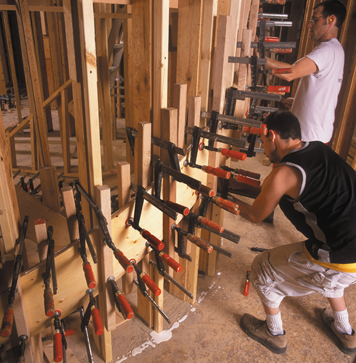 • These clamps feature a patented profiled rail, I beam design that minimizes the flexing or bending common with flat bar rails, patented non-slip locking device, zinc-finished drawn rail to prevent black marks from appearing on wood, protective non-marring pads, and a comfortable ergonomical grip wood handle