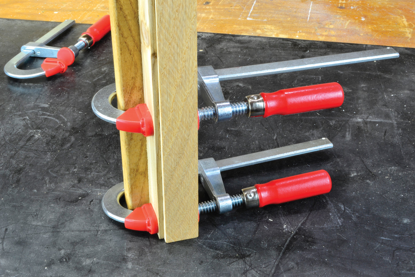 • Plastic pressure caps on top and bottom sections protect work piece surface