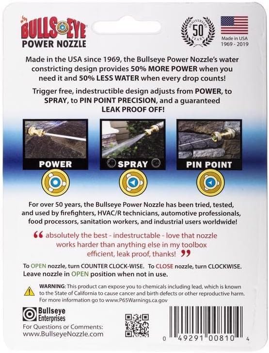 The Bulls Eye hose nozzle was originally engineered for fighting wild fires. This nozzle is extremely tough and almost indestructible. Bulls Eye uses a revolutionary patented design with an integrated washer. This integrated washer means that Bulls Eye nozzle is very efficient and will not leak. American made Bulls Eye hose nozzles are ideal for fire, marine, automotive, construction, industrial, farm, home and garden.