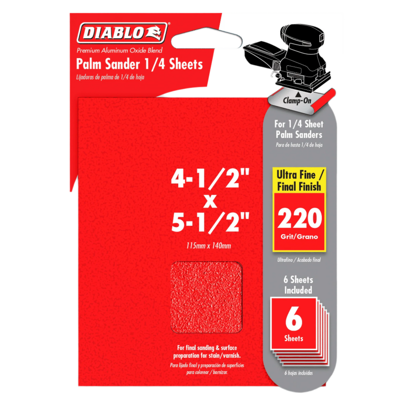 • Diablo's premium 4-1/2 in. x 5-1/2 in. 220-Grit (Ultra Fine) Clamp-on Sanding Sheets include break-through innovations that improve performance, extend sanding life and increase productivity. These sanding sheets are designed for use in 1/4 sheet palm sanders and are ideal for all types of wood, metal and plastics.