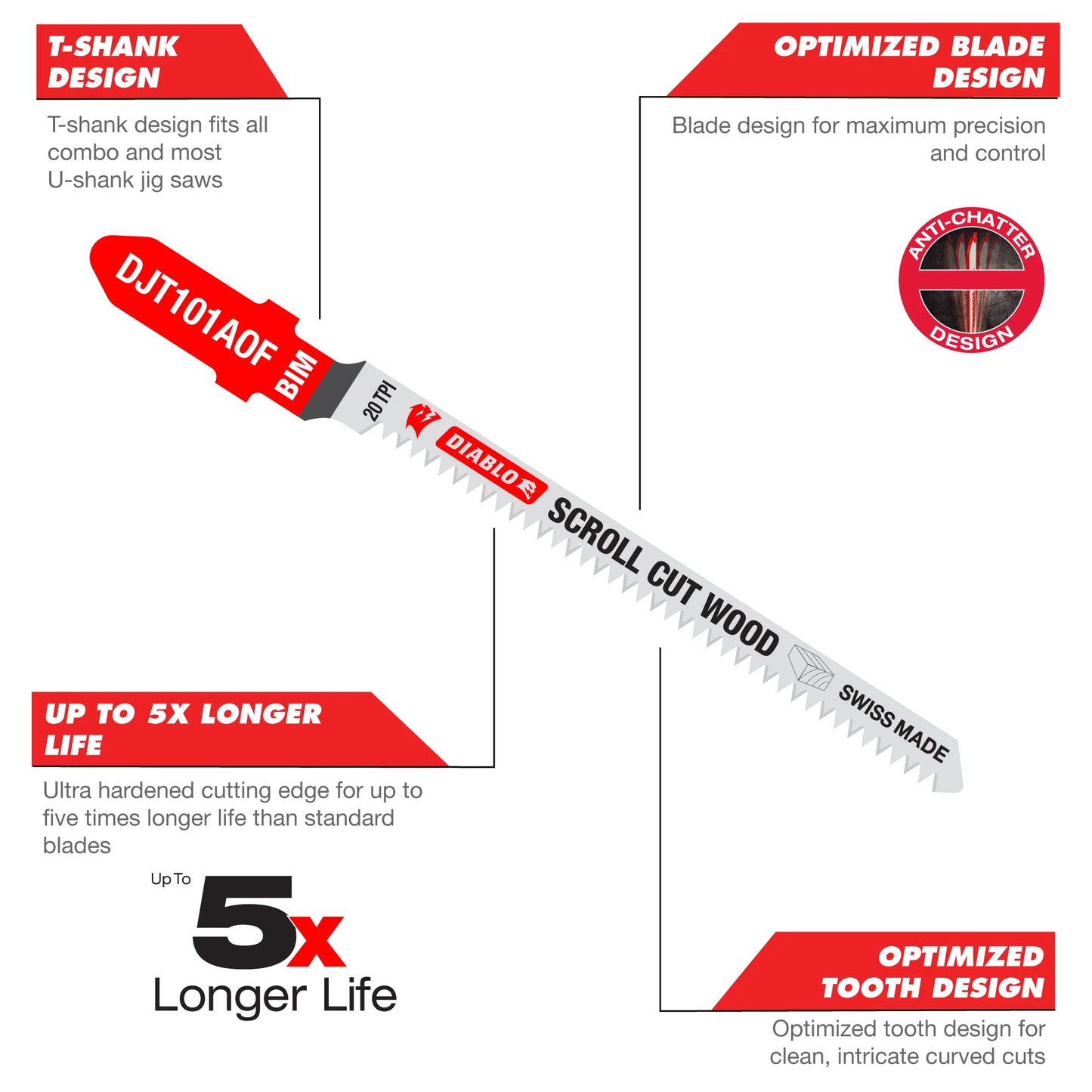 Diablo, DJT144DF5 Bi-Metal T-Shank Jig Saw Blades for Fast Wood Cuts 5 Pk
