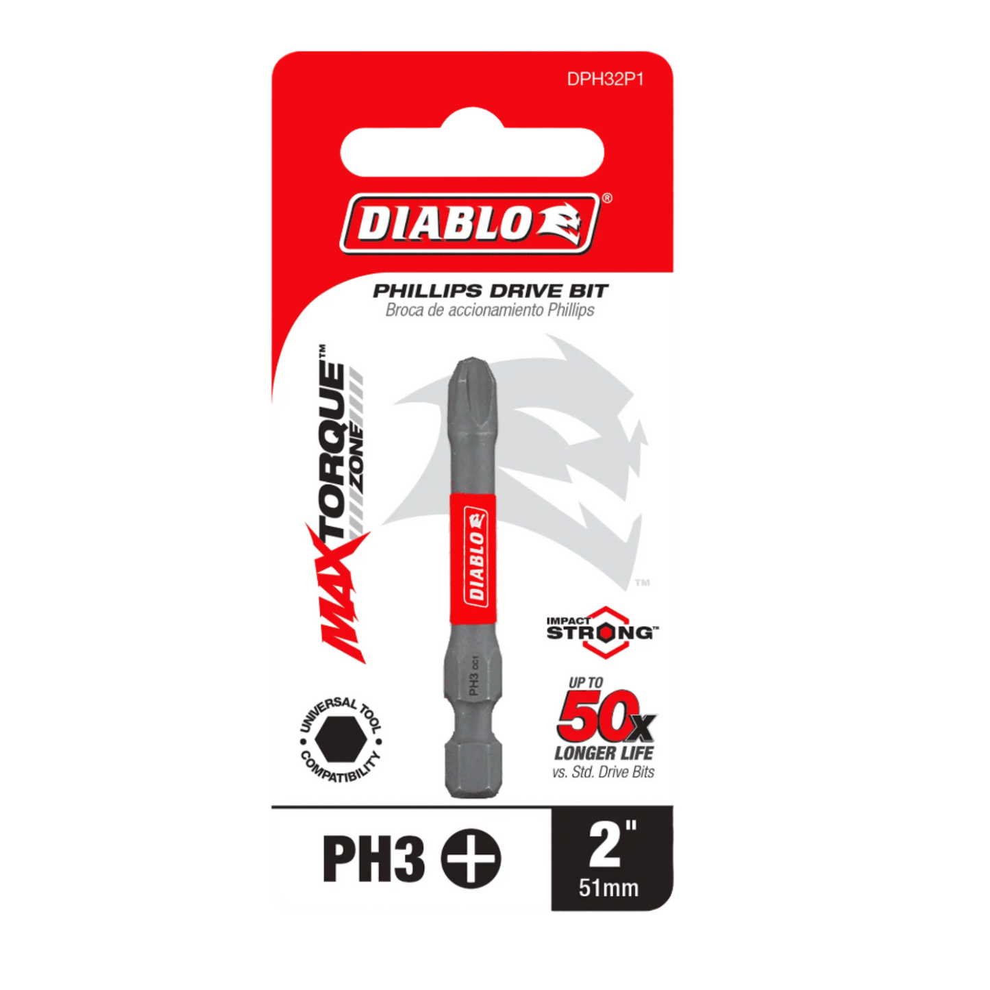 • Diablo's driver bit range of Phillips bits delivers maximum performance, extreme durability and up to 50x longer life when installing and removing fasteners. An optimized tip design provides a strong, precise grip that reduces wear, stripping and slippage. Torque Resistant Design absorbs torque for less stress at the tip when tightening and removing nuts and screws. This range is Impact Strong™, delivering increased shank stability and durability in cordless and corded impact and drill drivers.