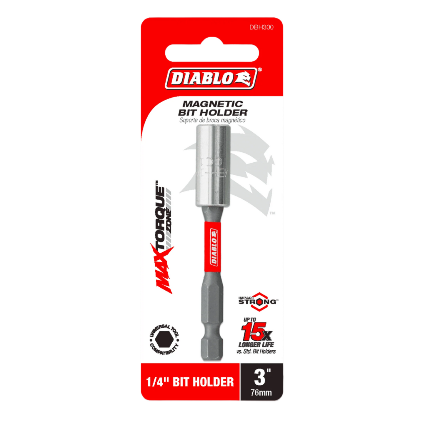 Diablo's magnetic drive bit holders deliver ultimate performance and maximum durability in extending the drill’s reach in hard to access areas. A high-strength, permanent magnet provides a secure, anti-wobble grip when fastening screws and nuts into a variety of applications. Torque Resistant Design absorbs torque for less stress on the holder and the bit. This range is Impact Strong™, delivering increased shank stability and durability in cordless and corded impact and drill drivers.