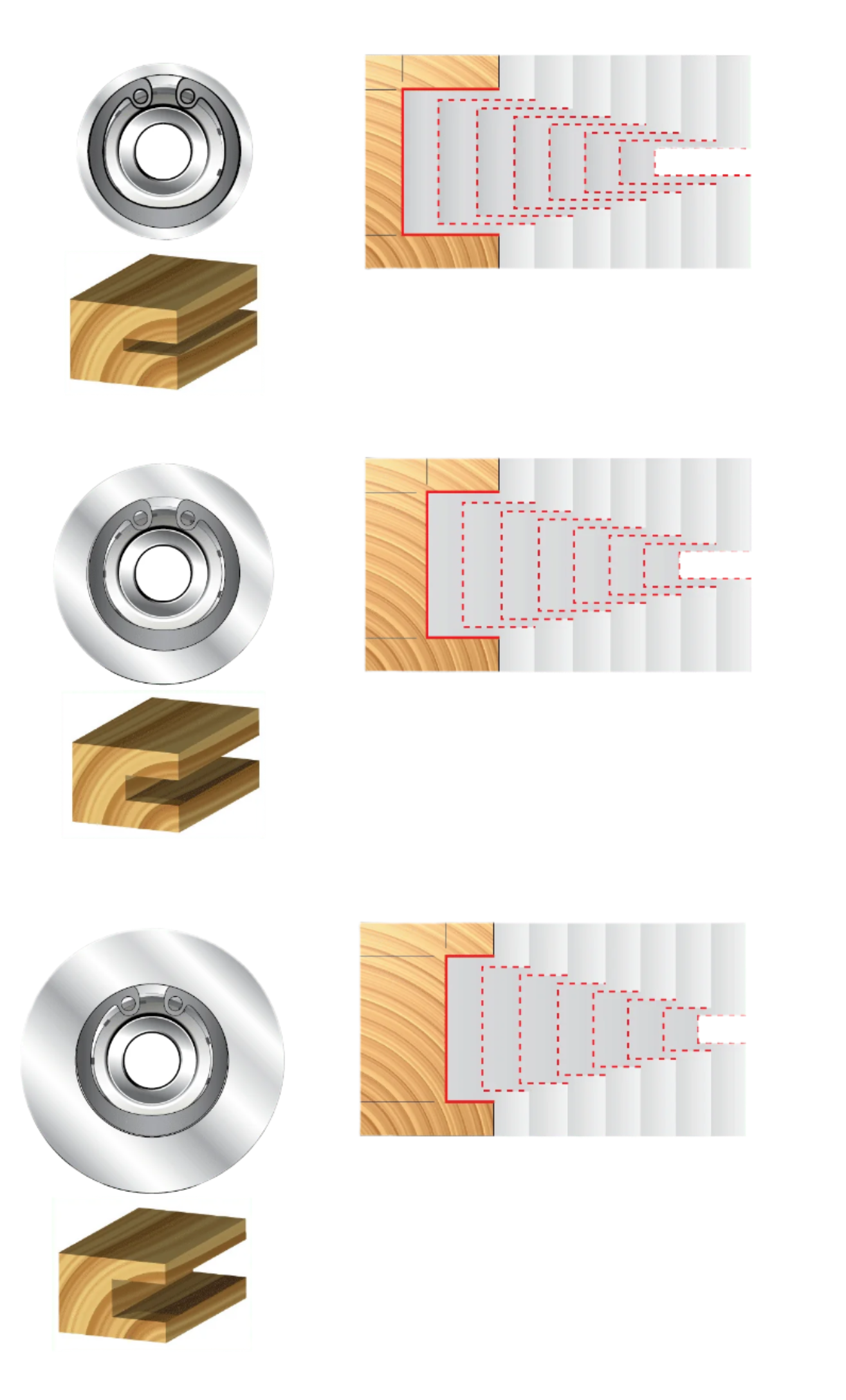 • Select three different cut depths (1/4", 3/8", 1/2") by changing the bearings