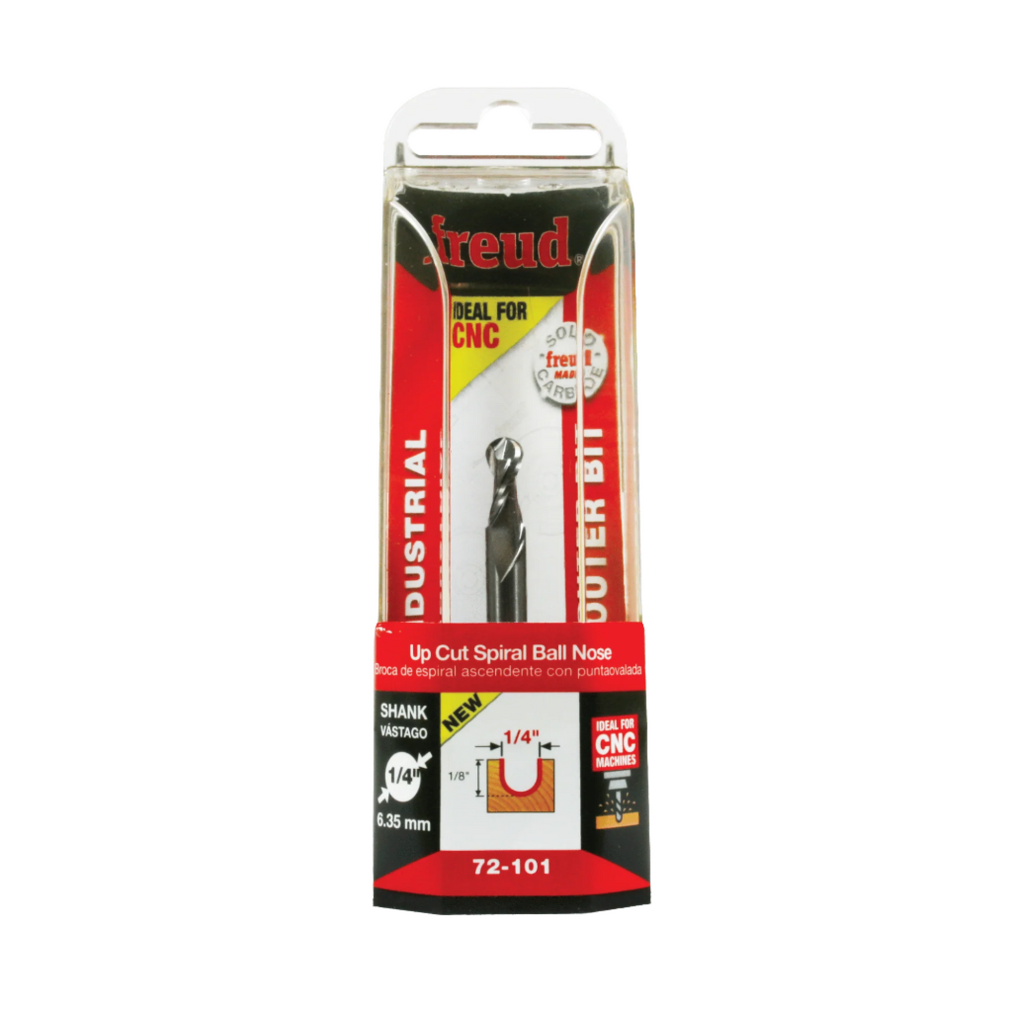1/2" Up Cut Spiral Ball Nose Solid Carbide Bit. Includes 2 flutes and 1/4" diameter. 1/4" Shank. Freud Solid Carbide Ball Nose Bits are ideal for routing plastics, composites, wood or solid surface materials. Use for grooving or edge work. Ideal for Wood, Wood Composites, Plastics (Hard & Soft), and Aluminum for 2D and 3D Carving.
