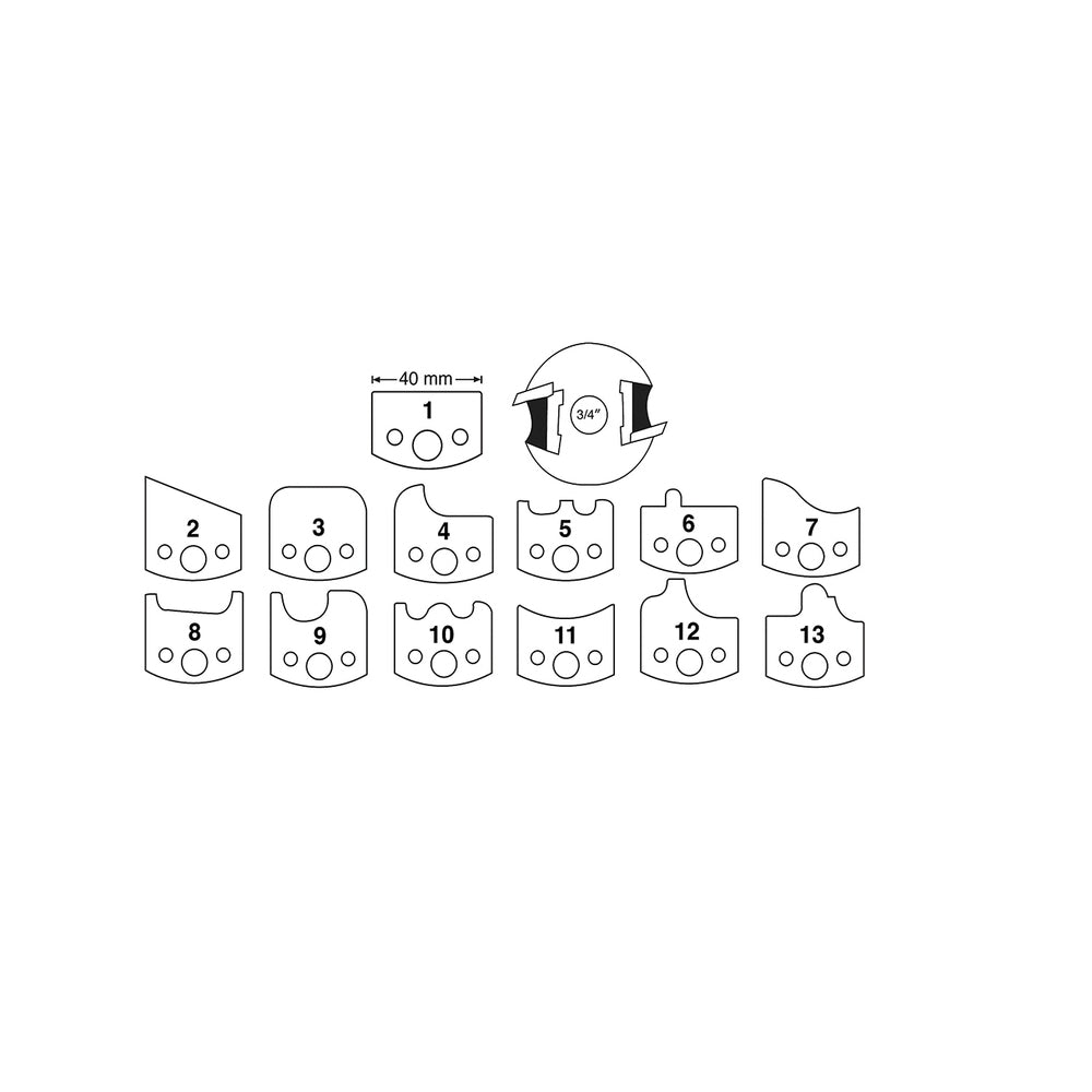 • 13 profile cutter sets having 2 positioning holes (1/4” I.D.), measures 1-1/16” wide x 5/32” thick x 1-3/8” high