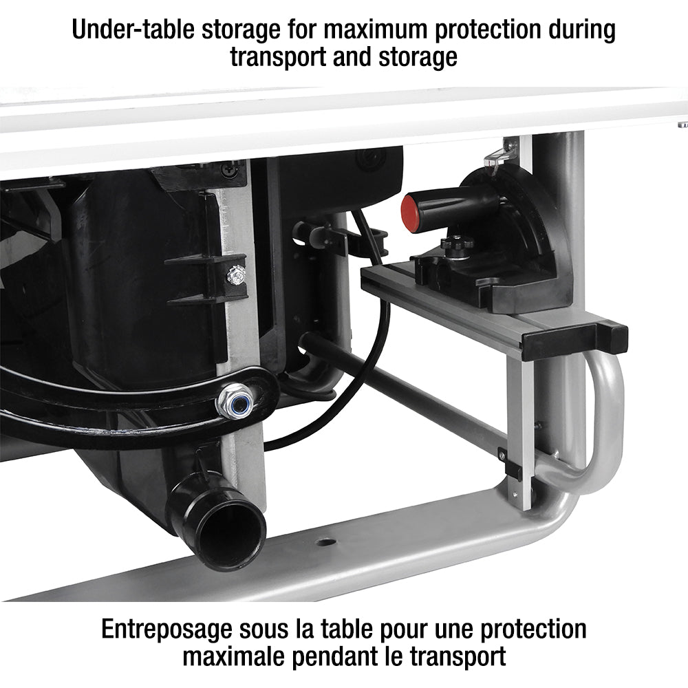 • Complete under-table storage stores the included rip fence, blade guard, miter gauge, push stick and blade adjusting wrenches for maximum protection