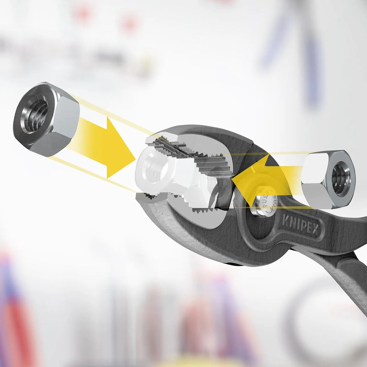 The Knipex 82 01 200 S02 Limited Edition TwinGrip Pliers are a special-edition version of the popular 8 inch TwinGrip model, offering the same versatile gripping performance with a unique look. This limited release features a dark grey protective oxide finish, black plastic-coated handles, and bronze-coloured lettering for a premium appearance. Designed for professional use, the pliers combine front and side gripping capability, making them ideal for loosening rounded bolts, worn screws, and stubborn fittings in tight spaces.