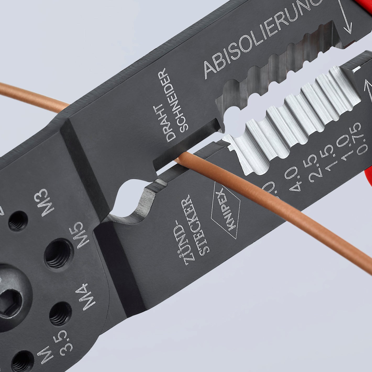 Knipex 97 22 240 Crimping Pliers for cutting cables, stripping wire and crimping 18-10 AWG insulated terminals and plug connectors as well as 20-10 AWG non-insulated open plug-type connectors (plug width 6.3mm). Includes threaded holes for cutting copper and brass screws threaded M 2.6, 3.0, 3.5, 4.0 and 5mm. Made in Germany.