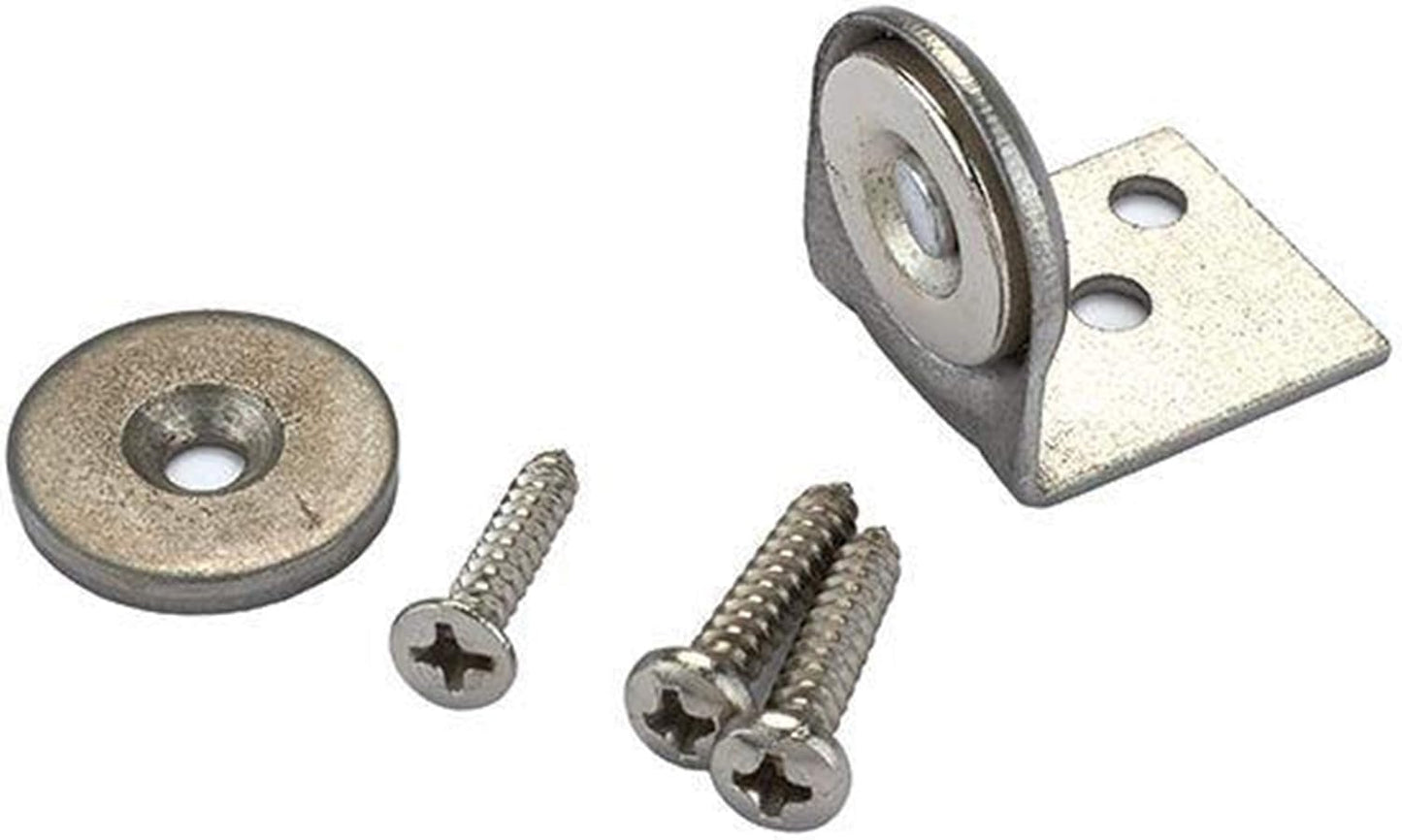 • Magnetic Cabinet Latch with Stainless Steel Housing. 90 degree 1-inch latch, 40 pounds pull force, L-bracket mounting. Strong rare earth magnets housed in stainless steel mounts create catches that will stand up to outdoor or marine use. Designed for the building, RV and marine industry. Use on doors, drawers, lids and even gates. Brackets and housings are produced from 204 stainless steel which has excellent corrosion resistance but retains its ferromagnetic properties. Nickel plated rare earth magnets provide lifetime service. All strike plates are 3mm thick and can be recessed to reduce the gap between cabinet and door. Stainless Steel mounting screws are included.
