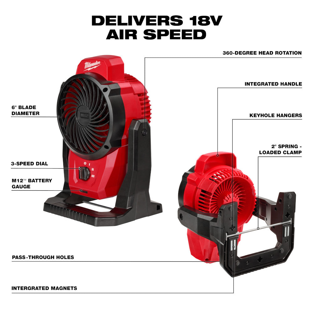 • The MILWAUKEE® M12™ Mounting Fan delivers 18V air speed anywhere on the jobsite, providing air performance up to 14 MPH and 400 CFM. The fan's 6 inch blade propels air at a fast rate, allowing for quick and efficient cooling, drying, or ventilation. This mountable fan is compact with integrated features for users to easily mount it in various locations around the jobsite. The Milwaukee cordless M12™ Mounting Fan has powerful magnets, a 2 inch spring-loaded clamp, keyholes, and pass-through holes to deliver air movement wherever needed. This battery powered fan provides users with unlimited directional airflow with 360-degree head rotation. The Milwaukee cordless jobsite fan offers three-speed settings - high, medium, and low, providing optimal air speed control. With up to 16 hours of run time on a MILWAUKEE® M12™ XC 6.0 battery, the M12™ Fan provides all day run time on a single battery charge (batteries and charger sold separately).