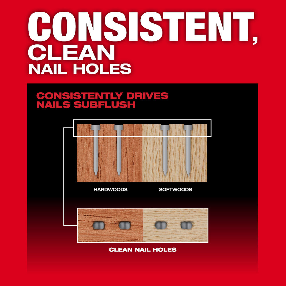• The MILWAUKEE® M18 FUEL™ 16 Gauge Angled Finish Nailer revolutionizes productivity on the jobsite, offering unmatched nailing capabilities without the hassle of a compressor and hose. With a nitrogen air spring mechanism, this cordless finish nailer ensures consistent nail depth in both hard and softwoods, creating clean and repeatable results effortlessly. The combination of the nitrogen air spring mechanism, Milwaukee POWERSTATE™ Brushless Motor, and REDLINK PLUS™ Intelligence provides a pneumatic-like nailing experience without any ramp-up time, resulting in efficient and productive work. The compact and ergonomic design allows for easy access in tight spaces, reducing fatigue during use. When used with an M18™ REDLITHIUM™ CP2.0 battery, this powerful nail gun can fire up to 800 nails per charge and is fully compatible with all M18™ REDLITHIUM batteries.