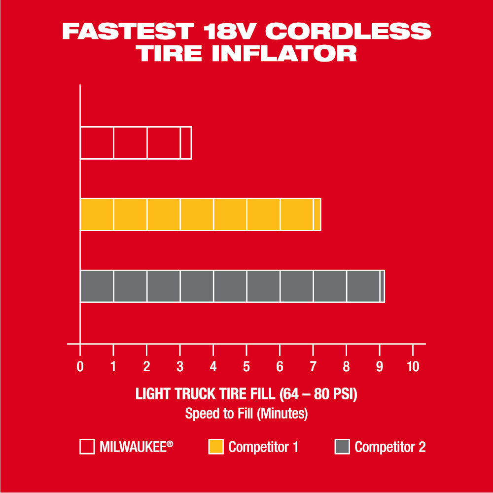 • MILWAUKEE® FASTEST 18V CORDLESS TIRE INFLATOR. The MILWAUKEE® M18™ Inflator delivers fast, accurate, easy inflation with the portability to take anywhere. Optimized for passenger, light truck, and other medium-duty tires. Rated to deliver max 150PSI, the high-efficiency motor tops-off 33” light truck tires in under 1 minute. The TrueFill™ Technology features an auto-pressure check that is designed to WAIT for the pressure to stabilize, CHECK the system pressure, and FILL until the desired target is reached. In addition, an Auto Shut-Off feature will stop inflation at selected PSI to prevent overinflation allowing users to set it & forget it. Furthermore, the unit includes 4 PSI memory slots, anti-vibration feet, a 36” inch hose with an all-brass Schrader chuck, and an on-board hose and nozzle storage.