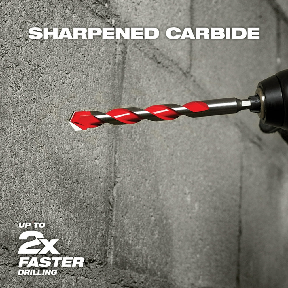 • The MILWAUKEE® 7/16" x 4" x 6" SHOCKWAVE™ Carbide Hammer Drill Bit uses sharpened carbide to deliver up to 5x longer life in concrete and up to 2x faster drilling into masonry material. Engineered with a precision ground tip, these bits deliver faster starts and less walking in concrete, brick, and block. The wide flute design removes dust faster, reducing heat and delivering more holes per charge. Milwaukee SHOCKWAVE™ Carbide Hammer Drill Bits have a 1/4" Hex Shank for versatility and are compatible with both impacts and hammer drills.