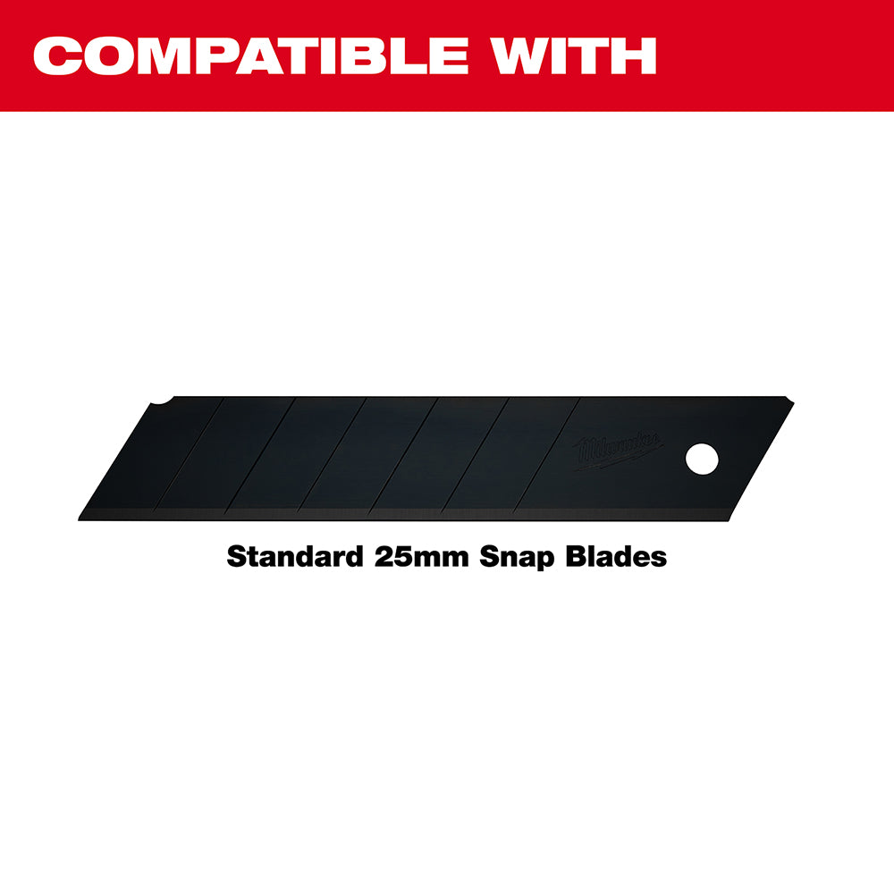 • The Milwaukee® 25mm snap-off knife has a new to world all metal lock designed for maximum durability that will hold up to 10x longer. The lock comes with a speed thread that allows for 2x faster blade adjustments. This snap-off knife comes with a 7-point detail-cut, micro Carbide blade and will last up to 2x longer, and up to 50% sharper. The overmolded handle offers a slip resistant grip and is acetone resistant and is backed by Milwaukee's Limited Lifetime Warranty.