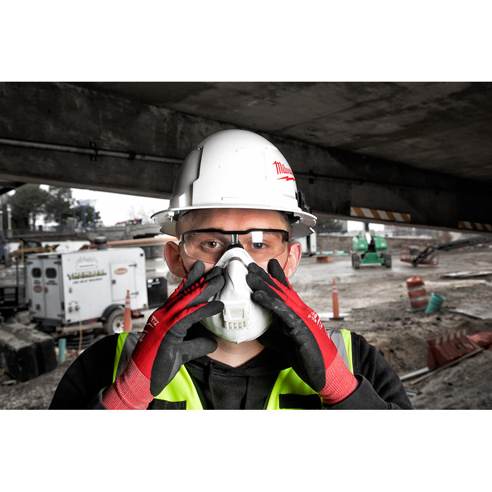 • The Milwaukee® N95 valved respirators are designed to stay cool while providing a better fit. The respirator valve reduces the construction mask's internal temperature by 10°F. The respirator masks feature two soft adjustable straps and a flexible nose bridge to achieve a better fit. The respirator masks are NIOSH N95 approved for non-harmful sanding, grinding, sawing and insulation particles.