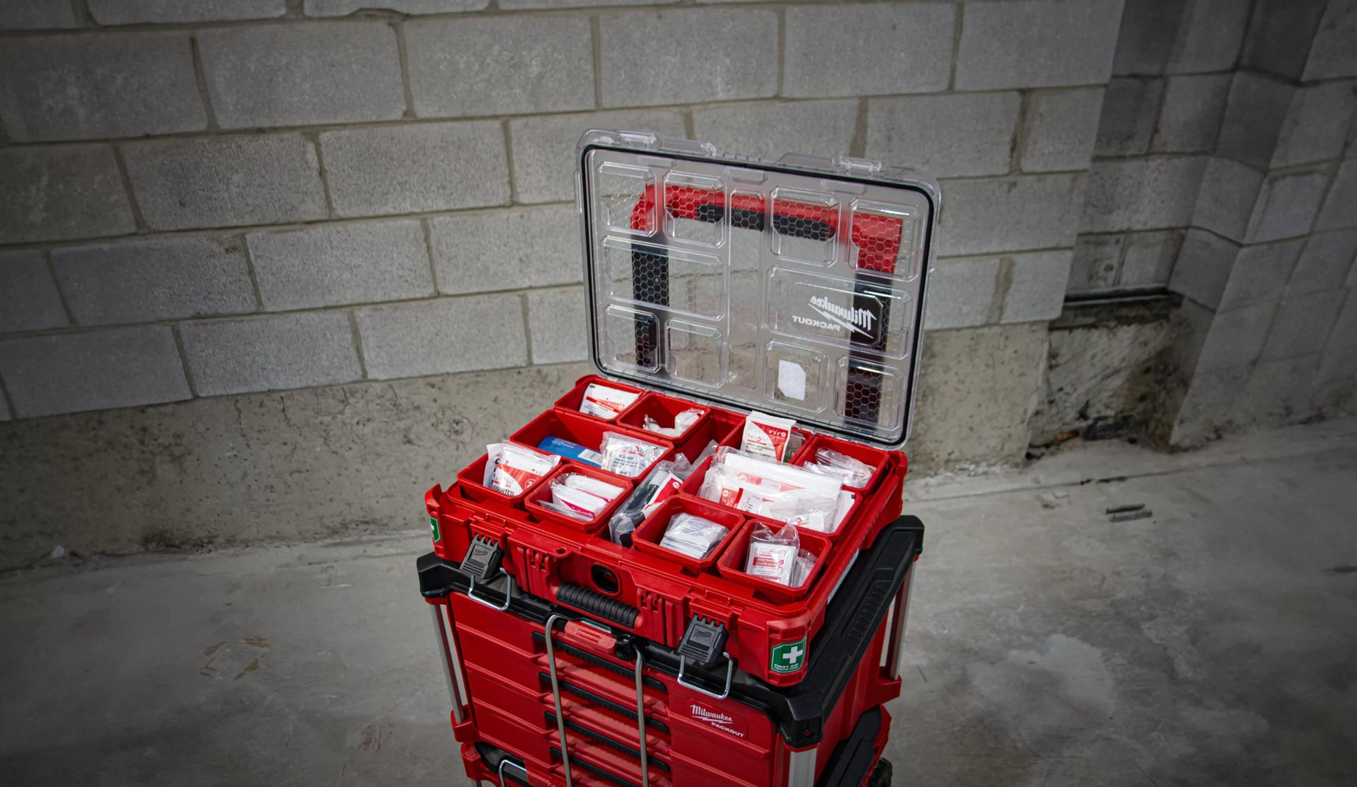 • The MILWAUKEE PACKOUT Type III Intermediate Small First Aid Kit is part of the most versatile, durable, modular storage system. The Milwaukee first aid kit's impact-resistant body keeps contents safe from drops and bumps on the jobsite. An IP65 rated weather seal protects bandages, adhesives, antibiotics, and other essential medical supplies from rain and other jobsite debris. This jobsite first aid kit's no-travel bin seals keep all contents secure and in their proper place. The MILWAUKEE PACKOUT Organizer comes with 112 essential first aid items meeting CSA Z1220-2017 (R2021) Type III Intermediate Small standard, tailored to the most common injuries you encounter on the jobsite. The transparent lid of the organizer seals the contents from migrating and shifting during transport. Heavy duty latches and reinforced hinges ensure that the organizer keeps the contents contained and protected.