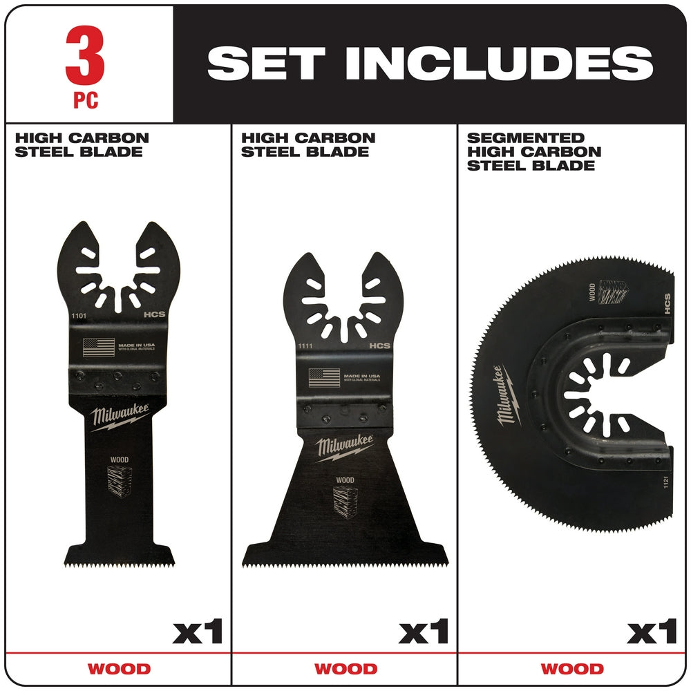 • The MILWAUKEE® Universal Fit OPEN-LOK™ 3-Piece Wood Cutting Oscillating Multi-Tool Variety Pack features an assortment of the next generation oscillating blades for optimal cutting performance in wood, PVC, drywall, and other soft materials. The oscillating wood blades are designed with aggressive, precision ground teeth for fast cuts in wood, drywall, and PVC. A 1-3/8" end-cut blade, a 2-1/2" end-cut blade, and 3-1/2" segmented blade offer versatile cutting to ensure the right blade for the right cut. This oscillating tool blade variety pack is designed and made in the USA with global materials.