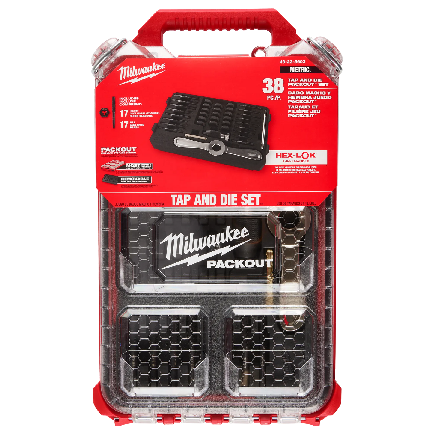 • Our MILWAUKEE 38-Piece Metric Tap & Die PACKOUT Set includes precision machined threading accessories and the most versatile Hex-LOK 2-in-1 Handle for the most common applications. The set features 17 straight-flute taps and 17 1 in hex dies with long-lasting laser-etched sizing for the clearest markings and includes a protective Black Oxide coating for corrosion resistance. The Hex-LOK 2-in-1 Handle combines the benefit of both internal and external threading within one handle by its compatibility with both 1 in hex dies and the MILWAUKEE tap collet. The handles ergonomic grip is designed to deliver ultimate user comfort while cutting threads. The all-metal construction allows for tool-free die and tap collet changes and is optimized for maximum balance and control when threading. The Plug Taps square shank is compatible with all standard tap handles or tap wrenches and is designed for through-hole threading. The Hex Dies 1 in hex shape is compatible with the Hex-LOK 2-in-1 Handle, as well as all standard 1 in Hex Die stocks. The set includes accompanying drill bits for pilot drilling and is designed for use with drill drivers. Our Taps and Dies are designed for cutting threads in the most common metal applications including brass, aluminum, mild steel, and more. For best results, use with cutting fluid. The set is organized in a PACKOUT Low-Profile Compact Organizer and includes a removable storage tray for versatile storage.