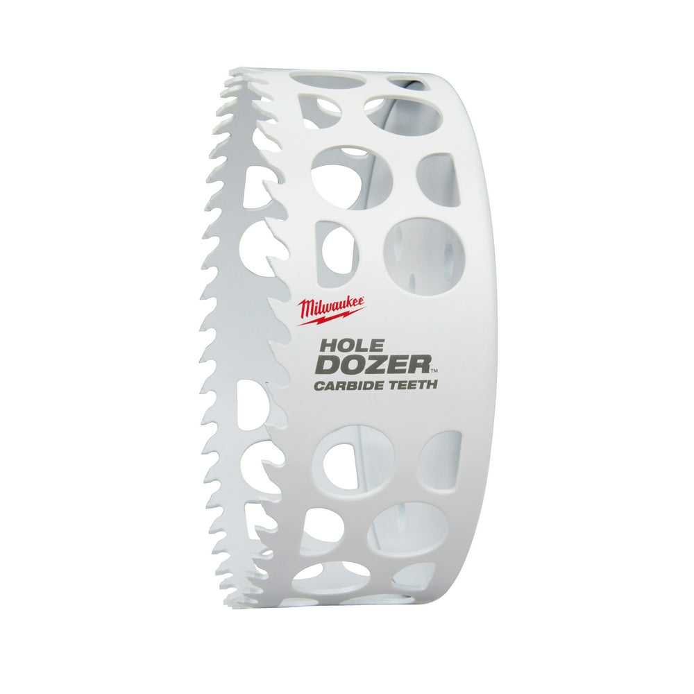 • The MILWAUKEE® 5" HOLE DOZER™ with Carbide Teeth Hole Saw features a new 3 TPI design that offers fast cuts with the durability of a bi-metal hole saw and life of a carbide hole saw. This Milwaukee hole saw provides the longest life in general purpose and extreme materials with the ability to cut through stainless steel, cast iron, fastener embedded wood, cement board, fiberglass, plaster, asphalt shingles, and more with ease. Deep gullets clear material fast while cutting, and Milwaukee's ALL-ACCESS SLOTS solve the frustration of plug removal for more productivity with less downtime between holes. The new slot design also provides increased pilot visibility for accurate placement and faster chip ejection keeping cuts cool. The HOLE DOZER™ with Carbide Teeth Hole Saw has a cutting depth of 1.62 in., allowing clearance to handle cuts in a wide range of materials. Milwaukee HOLE DOZER™ with Carbide Teeth Hole Saws are proudly made in the USA.