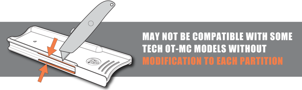Box partitions for TECH OT-LC, TECH OT-MC & TECH OT-SC – Quantity 2.  Designed to compartmentalize the large storage box area. The TECH OT-LC can accept up to four partitions; up to three partitions will fit in the TECH OT-MC, and the TECH OT-SC can accommodate up to two partitions. Two partitions form a confined area perfect for storing a 14oz fuel cylinder. Some models of TECH OT-MCs require a minor modification to each partition before use.